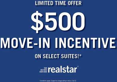 Rent Special available! LIMITED TIME OFFER | $500 MOVE-IN INCENTIVE ON SELECT SUITES!*