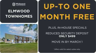 Up to One Month Free | Plus, in-house specials | Reduced security deposit - $499 | Move in by March 1 | Offer valid for select units only.