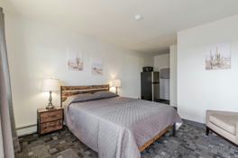 The studio apartments come furnished, queen bed, nightstands, chair, 55" TV, Full size fridge and Microwave etc.
