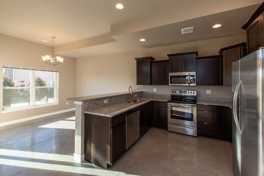 These luxury townhomes with spacious 2 car garage feature high-end finishes including granite counters, stainless steel appliances, modern espresso finish cabinetry, and retractable kitchen faucet in a stylish brushed nickel finish.