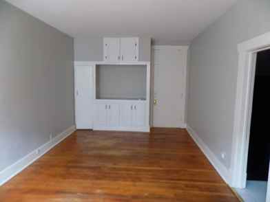 Refinished hardwood floors. Plentiful storage within kitchen. Built in wall of storage cabinets with TV console area in living room. Bathroom with tub/shower combo & raised sink vanity.