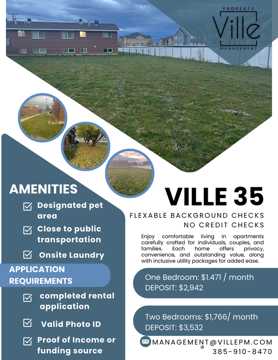 Inclusive Apartment for Rent – All Backgrounds Welcome!Welcome to Ville 35, where we believe in second chances and offer a welcoming community for everyone. Our spacious and modern [2BD/1BR] apartments are designed to provide comfort and convenience in a friendly environment. Property Features:Spacious living areasOn-Site washer and dryerPet areasCommunity Amenities:24-hour maintenancePet-friendly communityLocation:MagnaInclusive and Friendly:At Ville 35, we understand that everyone deserves a place to call home. We are proud to offer felon-friendly housing and encourage individuals from all backgrounds to apply. Our application process is straightforward and designed to be inclusive. Contact Us:Ready to make Ville 35 your new home? Contact us today to schedule a tour and learn more about our available units. Call 385-910-8470 or email ****