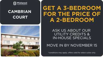 Rent Special available! Get a 3-Bedroom for the Price of a 2-Bedroom Get a 3-Bedroom for the Price of a 2-Bedroom Ask us about our utility credits and in-house specials. Move in by November 15 *Conditions may apply; offers valid for select suites only.