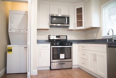Located in a triplex sitting back behind the parcel off the street, this is a completely updated apartment that offers stunning updates. Using high quality materials and thoughtful design the space is truly lovely. Upon entering one is greeted by an impressive white kitchen with quartz countertops and energy efficient stainless steel appliances. Hardwood floors, recessed lighting and double pane windows continue into the main room to help feel the warmth and richness. A stackable washer and dryer is included for convenience.