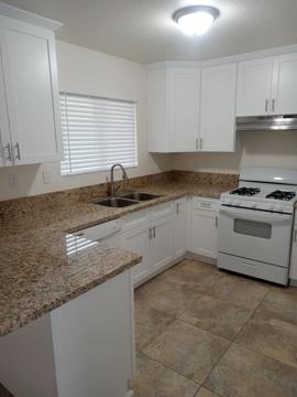 This spacious three bedroom two-story apartment has been upgraded with new kitchen cabinets, bathroom vanities and granite counter-tops. It has two full bathrooms, a private backyard patio, an attached single-car garage with laundry hook-ups, central heating and air, a gas range, and a dishwasher. Located in the Desert Knolls community of Apple Valley, this apartment is close to everything the town has to offer. Our apartments are month-to-month so you can stay as long as you like. Pet dog or cat welcome with an extra $200 deposit and $25 monthly pet rent.
