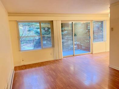 Spacious 1bed/1bath (approx 750sf) apartment available now. Big windows in living space and bedrooms + a spacious deck, overlooking greenbelt - nothing but trees out of every window! Lots of in-unit storage (multiple large closets), laminate flooring throughout living areas and carpet in the bedroom. Clean and bright laundry room on-site, right outside the elevator for easy access.