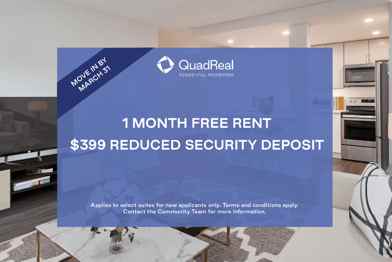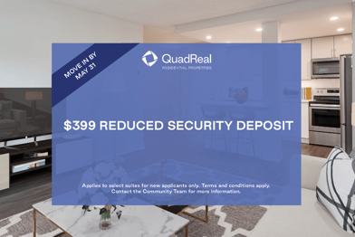 Rent Special available! $399 Reduced Security Deposit Applies to select suites for new applicants only. Terms and conditions apply. Contact the Community Team for more information.