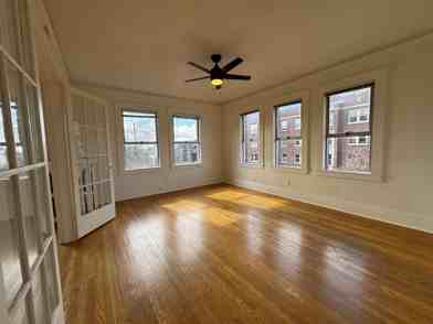 This spacious corner 1BR apartment features a circular floor plan, large closets, and abundant natural light. French doors separate the living area from the bedroom, creating a flexible and inviting layout.