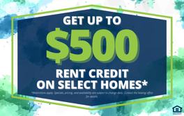 Rent Special available! Up to $500 OFF Select Homes! *Restrictions apply. Specials, pricing and availability subject to change daily. Contact the leasing office for details.