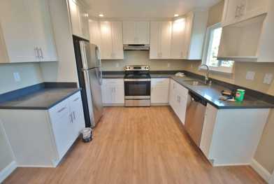 Spacious two bedroom, one bathroom renovated apartment with laminate hardwood floors, quartz countertops, stainless steel appliances, recessed lighting, and balcony off kitchen (views of the hills).