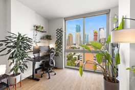 Discover urban living at its finest in this oversized 1-bedroom, 1-bath residence in the heart of Downtown Jersey City. This east-facing home is bathed in natural light through floor-to-ceiling windows, offering panoramic views of the city skyline, Hudson River, and Liberty State Park. The open-concept layout features hardwood floors throughout, soaring ceilings, and a spacious walk-in closet for ample storage. The modern kitchen is equipped with stainless steel appliances, granite countertops, gas cooking, and under-cabinet lighting. Additional conveniences include an in-unit washer/dryer and central air conditioning for year-round comfort.