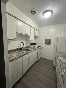Many updates, newer countertops; newer flooring & carpet; newer stove; updated bathroom; patio with balcony; all new faux blind window coverings