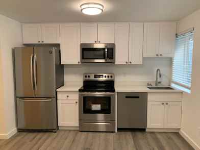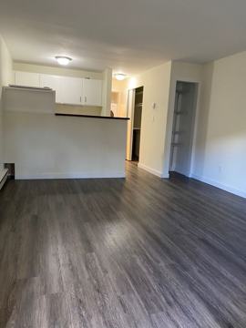 Ground floor studio apartment with exterior access in a 17-unit building in Capitol Hill. Large living space with LVP plank flooring with divider for kitchen area, a full bath and washer and dryer in unit and a spacious closet.