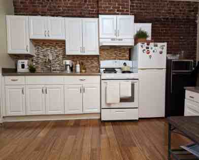 This 1 bedroom / 1 bathroom apartment features a modern kitchen, hardwood floors, an exposed brick wall, and a tiled bathroom. This open-concept living space also features heat and hot water included in rent!