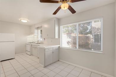 Kitchen has refrigerator, gas range with oven, stainless steel sink with gooseneck faucet and plenty of cabinets for storage along with a small pantry and two windows for lots of natural light!