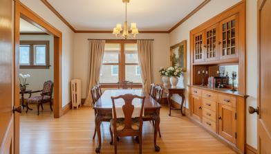 As you step inside, you'll be greeted by an abundance of natural light streaming through oversized windows, highlighting the warmth of gleaming hardwood floors and the timeless architectural details that make this property feel like home. The living room offers a cozy setting to relax, entertain, or work from home, while the adjacent dining area provides plenty of room for meals and gatherings.