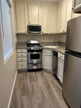 -Kitchen: cabinets, counters, and tile flooring. Stainless steel appliances (refrigerator with ice maker, range, microwave, and dishwasher)