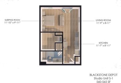 Each apartment features stainless steel appliances, hard-surface counter tops, laminate wood plank flooring, and luxurious tile flooring in the bathrooms. The Blackstone Depot features under-building heated parking.