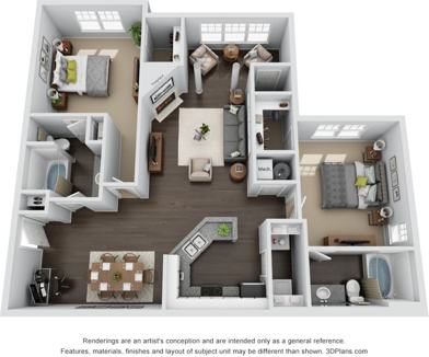 Our Denali Elite floorplan is a 1295 square foot 2-bedroom, 2-bathroom apartment with lovely sunroom. Our Elite finish package includes: • Updated shaker style, soft close, white cabinets • Granite countertops • Tile backsplash in the kitchen • Ceiling fans in the bedrooms and living room • Full sized washer and dryer connections • Gas fireplace in the living room • Built in desk area *Our units have high quality hardwood inspired flooring and plush carpets. Depending on what floor of the building the unit is on there is more or less carpet. Bottom floor units have carpet only in the bedrooms, upper levels have carpet throughout with the vinyl in the kitchen/bathrooms.