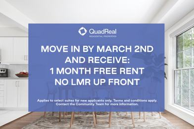 Rent Special available! 1 Month Free Rent Applies to select suites for new applicants only. Terms and conditions apply. Contact the Community Team for more information.