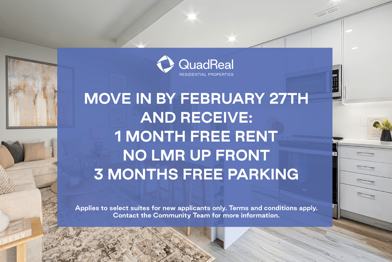 Rent Special available! 3 Months Free Parking Applies to select suites for new applicants only. Terms and conditions apply. Contact the Community Team for more information. &