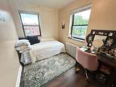 Each apartment contains a large master bedroom with a large double wide window and a smaller second bedroom, which single people use as an office or den. The second bedroom is smaller but does fit a double bed, night stand and chest or set of drawers. Please note the photos of the living room/kitchen/bathroom are of the exact unit number, but bedrooms may be example photos from another unit. Every unit has same size bedrooms, only difference would be if the smaller bedroom has one or two windows.
