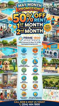 Welcome to your next home at Prime Properties, a gated apartment community designed for comfort, convenience, and value — just minutes from Baylor University. Whether you're a student, young professional, or family, our modern apartments offer the perfect blend of space and lifestyle — now with ZERO security deposit to move in!