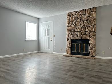 -Living room has a stone fireplace.