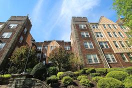 The property offers spacious apartment layouts with features such as hardwood flooring, large room sizes, and strong natural light. Residents benefit from shared laundry facilities within the building and a residential setting on a tree-lined street.