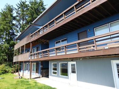 Auke Bay Harbor Oceanview, large living room windows, covered exterior common deck, 1 Bed, 1 Bath apartment, 450 sq ft, coin-op laundry, 1 assigned parking space, covered walkways and lawns. Minimum Lease to April 30, 2026