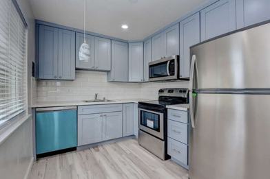 Offering a beautifully renovated 1 bedroom, 1 bathroom apartment. Modern kitchen has pale blue cabinets, brand new black and stainless steel appliances which include, dishwasher, refrigerator, electric oven and glass range cook top, microwave over stove doubles for as cooking ventilation. New beach wood looking laminate flooring throughout the unit.