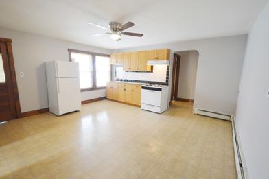 1-bedroom apartment in Fitchburg, MA. Hot water included. Oil forced hot water baseboards. The kitchen is very spacious and has part tile flooring, part hardwood floors. This property includes a coin operated washer and dryer machine. The bathroom has light blue tile surrounding, and the floor is also tile. The shower has a glass door and the walls have convenient wooden hooks. Off-street parking available.