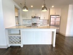 Wood Co. 306 features beautiful kitchen finishes such as quartz countertops, marble back-splash, custom wood cabinetry, a kitchen island with bar-stool seating, stainless steel french door refrigerator, a built-in wine rack, and a 5 burner gas range.
