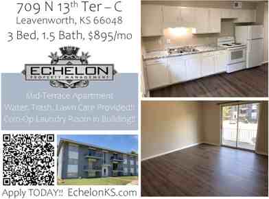 MUST SEE!! Three Bed, 1.5 Bath, Mid-Terrace Apartment!! Kitchen includes a Walk-In Pantry and Dining Nook!! Coin-operated Laundry Room conveniently located in the building. Water, Trash, and Lawn Services PROVIDED!! No Pet. No smoking. Minutes away from Downtown Leavenworth, Fort Leavenworth, Lansing, and the Greater Kansas City Area!!