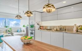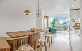 Modern 1-bedroom, 1-bathroom condo with northeast-facing views of the city and harbor. This thoughtfully designed home offers an open-concept layout, a built-in dining table with extra storage in the benches, stainless steel appliances, and an integrated fridge for a sleek, seamless cabinetry finish. Stone flooring runs throughout the living areas, with plush carpeting in the bedroom for added comfort. The home also features radiant in-floor heating and cooling, in-suite laundry, and comes with one parking spot. Gas and water are included in the rent. One small pet may be considered.