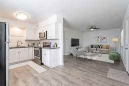 Inside, you'll find fully appointed kitchens with full-size electric appliances, wood plank vinyl flooring (in select units), floor-to-ceiling windows, ceiling fans, walk-in closets, and individual storage units for your convenience.