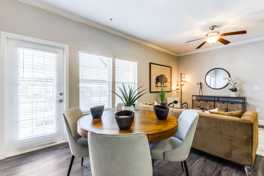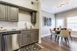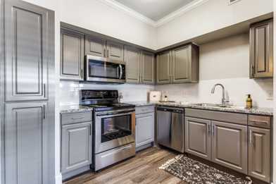 Ellwood at Lake Travis features a range of thoughtfully designed one, two, and three-bedroom apartments, including townhome-style layouts with private attached garages. Each residence boasts modern interiors with stainless steel appliances, granite countertops, and spacious living areas. Select homes offer private fenced backyards, oversized windows, and up to 15-foot ceilings, enhancing the sense of space and comfort