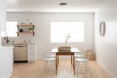 - Open wood shelving in the kitchen