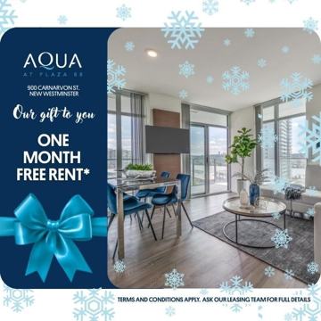 At AQUA, we understand your time is valuable, and we also put emphasis on health and wellness. Our building is centrally located to all essential amenities including a three-minute walk to the New Westminster Skytrain station, a six-minute walk to Douglas College, and a seven-minute walk to the beautiful Fraser River. From the moment you enter AQUA, you will be left with a lasting impression and a warm welcome inside the two-story lobby. The gracious entrance welcomes residents home, providing an immediate escape from the hustle and bustle of the city. The building has indoor parking stalls and electric vehicle stalls for tenants, indoor Car Share stalls, indoor retail stalls and indoor visitor stalls, along with wireless internet access throughout the building's common areas. Virtual Tour Floor Plan Layouts are for Concept & Finishes only. Layout may vary from actual Unit. Learn more at the building website here!Discover modern living at AQUA. This 40-storey building is centrally located near essential amenities, including a three-minute walk to New Westminster SkyTrain, a six-minute walk to Douglas College, and a seven-minute walk to the beautiful Fraser River. The interiors at AQUA, blend style and function with meticulous space optimization. Floor-to-ceiling windows invite natural light, enhancing the fine finishes and furnishings. Each suite features sleek window blinds, efficient ceiling fans, wide-plank vinyl flooring, and baseboard heating for comfort and convenience. We do have select Furnished studio units available. AQUA offers health-centered amenities like a fitness center, saunas, and yoga studio. The versatile recreational lounge includes a dining room with a professional kitchen, a games room, and spaces for both socializing and quiet time. The study lounge with patio access is ideal for meetings or study sessions. Residents have access to a suite of health-centered activities. A fully-equipped fitness center offers residents state-of-the-art equipment and training. Our recreational lounge offers versatile spaces for activities, including a dining room with a professional kitchen for dinner parties and a games room for fun and laughter—perfect for quality time with loved ones. Saunas are located near the fitness facility on the 6th floor amenity space. Take the time to also rejuvenate in AQUA'S yoga/movement studio, surrounded by pure bliss in the 6th floor garden pavilion. The AQUA study lounge offers students and professionals a flexible space for meetings or study sessions, with patio and garden access, and options for both quiet time and socializing. Contact us now to book your in-person or Online tour(Facetime or Whatsapp Video Tours).Ask us about our special promo: One-month free rent on a 13-month lease!
