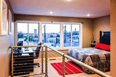 #206 is a beautiful split level plan with a loft bedroom overlooking the downtown skyline. The bedroom is spacious enough for a king size bed and furniture.