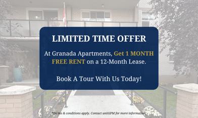 Rent Special available! Get 1 MONTH FREE RENT on a 12 Month Lease Get 1 month FREE RENT* when you sign a 12 month lease with us! Book your tour with unitiiPM today! * Terms and conditions apply. Contact