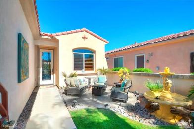 This home with a private yard, front and back, has a nice water feature. It is well groomed with punches of color and interesting accessories setting a nice theme of comfort and beauty. What a great way to spend a Desert vacation!