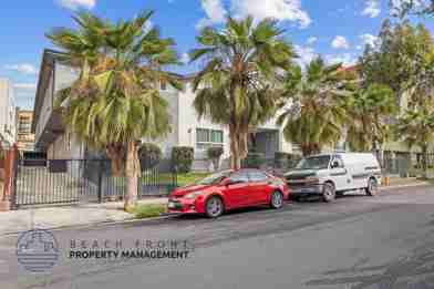 Located at 5427 Carlton Way in Los Angeles, this property offers studio, one-bedroom, and two-bedroom apartments. Studio units range from approximately 500 to 600 square feet, one-bedroom units from 700 to 800 square feet, and two-bedroom units from 900 to 1,000 square feet. Each apartment features hardwood flooring, recessed lighting, and large windows that provide ample natural light. Kitchens are equipped with stainless steel appliances, including a gas range, dishwasher, microwave, and refrigerator, complemented by sleek cabinetry and a geometric tile backsplash. Bedrooms include mirrored sliding closet doors with built-in shelving. Bathrooms feature modern fixtures, a sleek vanity, and stylish tile design. Additional amenities include in-unit air conditioning, ceiling fans, and window coverings. Pets are permitted on the premises. Utilities are not included in the rent. Assigned covered parking is available.