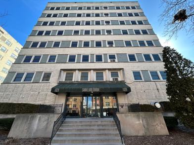 Beautiful one bedroom apartment in an ideal downtown location! This unit is getting new vinyl flooring and a new kitchen. This cozy, 6th floor unit has carpet in the living area and bedroom, which helps keep the whole building quiet. New, storm proof windows and an included air conditioner help keep the apartment comfortable and affordable in every season.