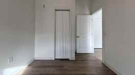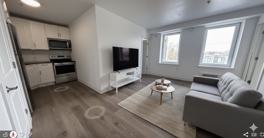 The apartment features modern, neutral-toned finishes throughout. The flooring is a durable, wood-look material that adds warmth and character to the space. Clean, white walls and trim create a bright, airy atmosphere, while also serving as a blank canvas for personal decor.