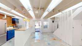 Upstairs, enjoy a wide open bedroom / flex loft space with large slat painted wood floors, vaulted ceilings, a large walk-in closet / bonus work area, and a skylight. Spa-like full bath is giant, with a long, deep-soaking bathtub, waterfall shower head from the ceiling, and shower surround enshrouded in brick and glass block.