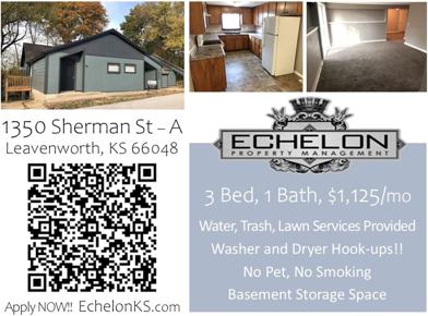 Central Leavenworth location, 3 Bed, 1 Bath Duplex on a residential street with no through-traffic!! Living Room opens to a private deck!! Kitchen includes Fridge, Oven/Range, and lots of counter space. Washer and Dryer hook-ups conveniently located on the main level!! Minutes away from Downtown Leavenworth, Fort Leavenworth, Lansing, and the Greater Kansas City Area!! Off-Street Parking. No Pet, No Smoking. Water, Trash, Lawn Services PROVIDED!! No steps on the main level. Basement storage area!! Showing Properties for Applicants Only. Apply NOW!! EchelonKS. com Professionally managed by Echelon Property Management, 913-705-0201. Rental qualifications: Credit score of at least 600, no evictions within the past 7 years, at least 90 days verifiable income, monthly income of at least 3 times the rent, at least 18 years of age.