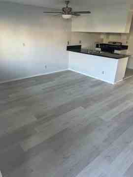Large Lower Unit Open And Inviting Living Room Area With Windows Bringing In Natural Vinly Plank New Floors Quartz Kit Countertop Stove Dishwasher, Fridge All In A Gated Building 1 Pkg Laundry On Premises And Ceiling Fan