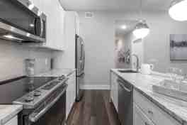Residents of The Gateway can enjoy a fully furnished rooftop deck with stunning views of the Center City skyline. All units feature LATCH keyless entry system, modern quartz countertops, 42-inch white shaker cabinetry, high-end stainless steel appliances, luxury tile selections, custom California-style built-in closets, double sink vanities, glass-enclosed showers, in-unit laundry, and plenty of natural light from the floor-to-ceiling windows.