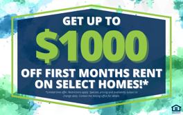 Rent Special available! Save up to $1000 off first months rent on select homes! *Limited time offer. Restrictions apply. Specials, pricing and availability subject to change daily. Contact the leasing office for details.